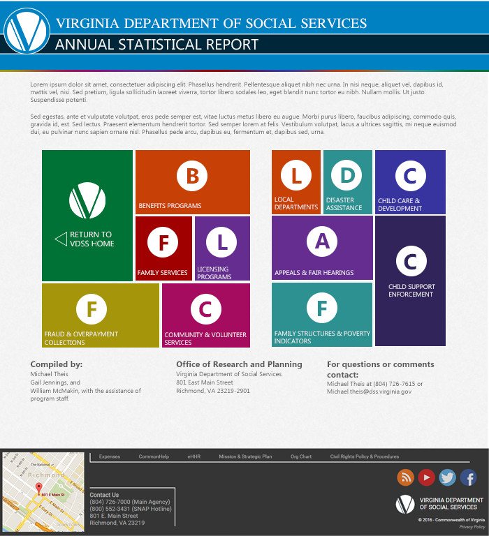 Recently, the agency purchased a subscription to Tableau, a interactive business analysis and reporting tool. The system is designed to be embedded into any website of the consumer's choice. In this case, the agency requested a custom template for the software. It was requested that the design mimic the current VDSS website, but also have a presence distinct to it's own.
