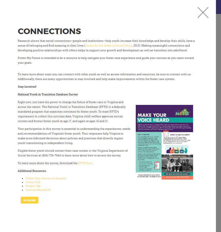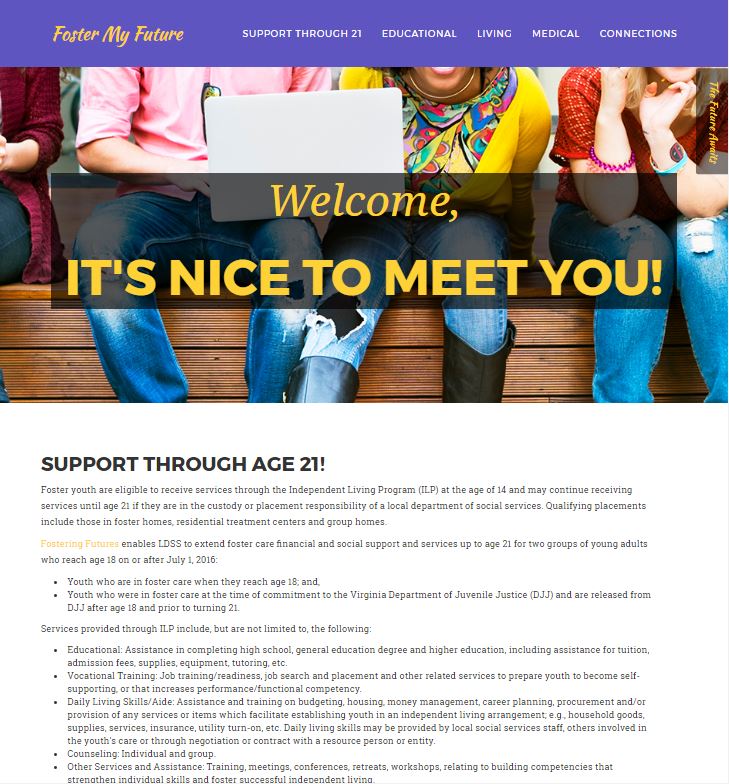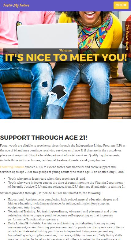 Foster my future was a site created to support the Foster My Future campaign launched May 1st, 2017. This campaign sought to encourage individuals of all ages, nationalities and orientation of the importance of foster care. In this project, I served as project manager, coordinating the efforts of the web team and removing obstacles which would have prevented the team from completing the task by the project due date. Through the efforts of the web team and my guidance, we completed the site days before the project due date and, once we received the site content, launched the site in conjunction with the campaign announcement. The site is designed using a modular framework, since it is expected to grow. In it's initial state, as displayed, it serves as a single page site; however, it will eventually grow into one utilizing multiple pages