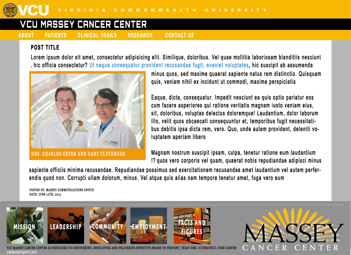 This mockup and its corresponding site were created as an assignment for the Massey Cancer Center. I was tasked with styling the linked page without modifying any of the HTML of the page. I found this assignment very provocative to the extent that I've chosen to showcase the site and their site improvement proposal. The task itself, though relatively simple from an outside point-of-view, is actually a complex issue that many web designers face on an everyday basis. Content Management Systems have become the primary solution for large entities to manage their web presence. However, they can be very inflexible when it comes to the HTML output they produce. This project was the perfect illustration of how web designers overcome these challenges.
