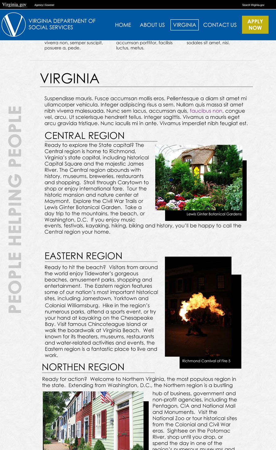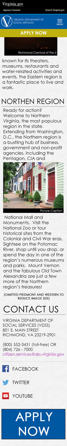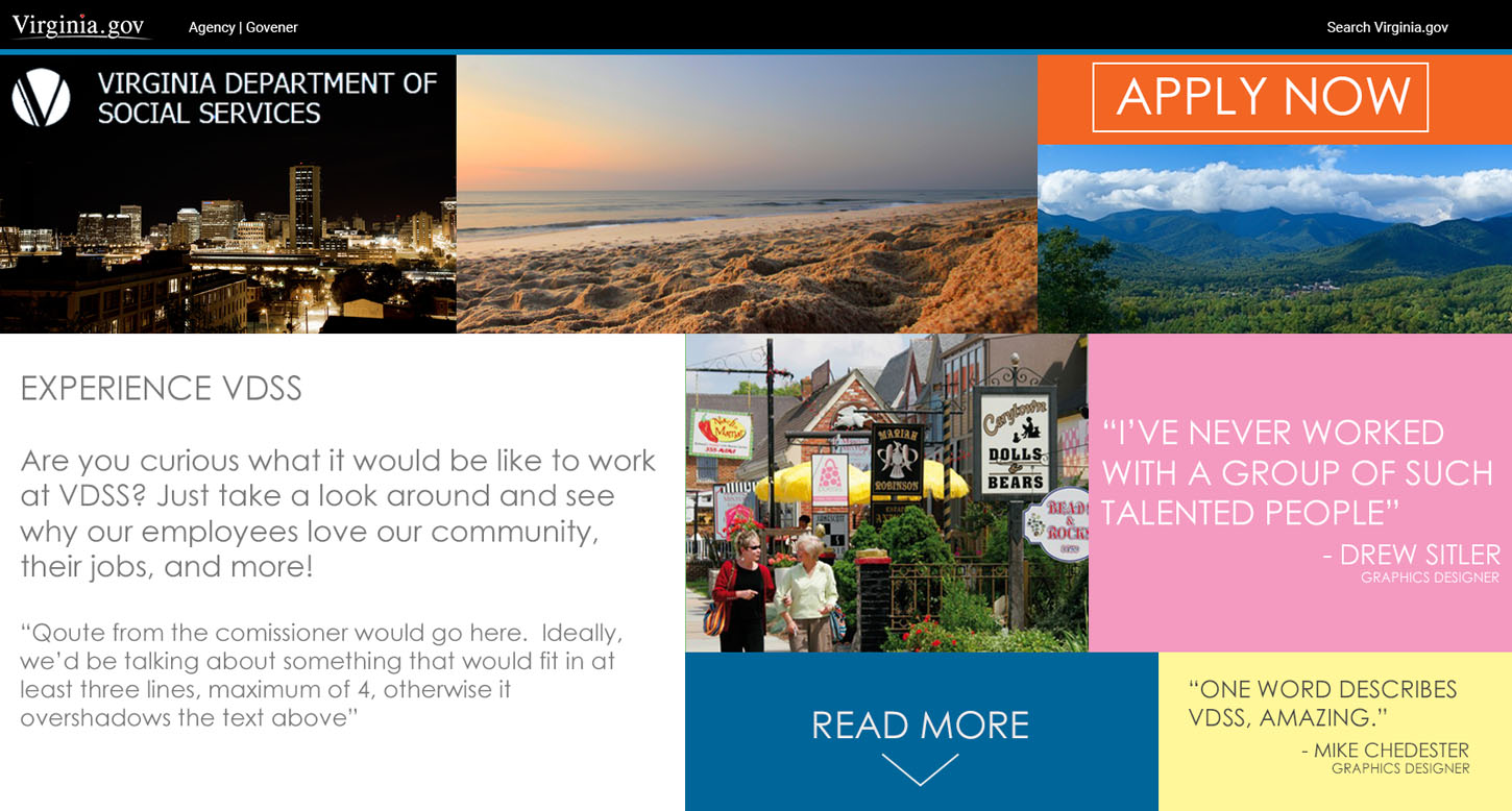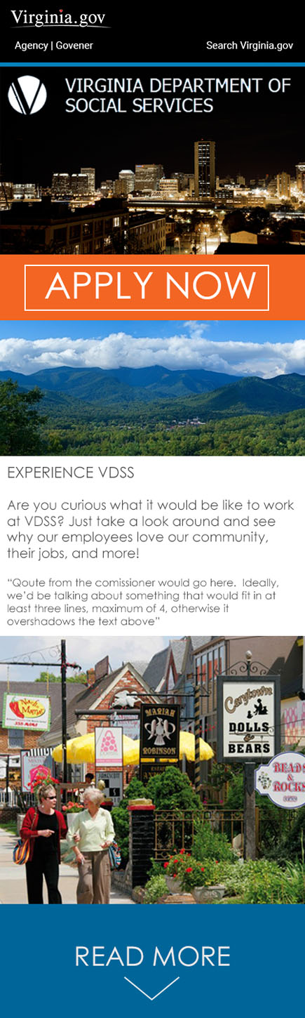 The VDSS Career Campaign was created to compliment the agency's adoption of their own employment application system. Prior to this initiative, the agency relied on the state application system. As the agency grew, the need to separate their postings from the rest of the state increased. The campaign consists of two primary facets, a gateway to the PeopleAdmin Application and the system itself. My role is to design and develop the gateway site and to skin the application to match the gateway.