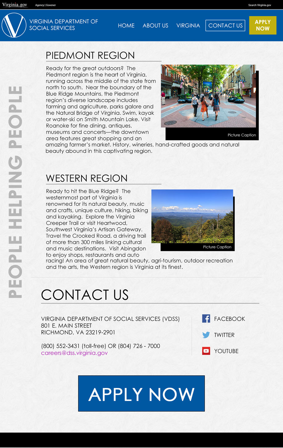 The VDSS Career Campaign was created to compliment the agency's adoption of their own employment application system. Prior to this initiative, the agency relied on the state application system. As the agency grew, the need to separate their postings from the rest of the state increased. The campaign consists of two primary facets, a gateway to the PeopleAdmin Application and the system itself. My role is to design and develop the gateway site and to skin the application to match the gateway.